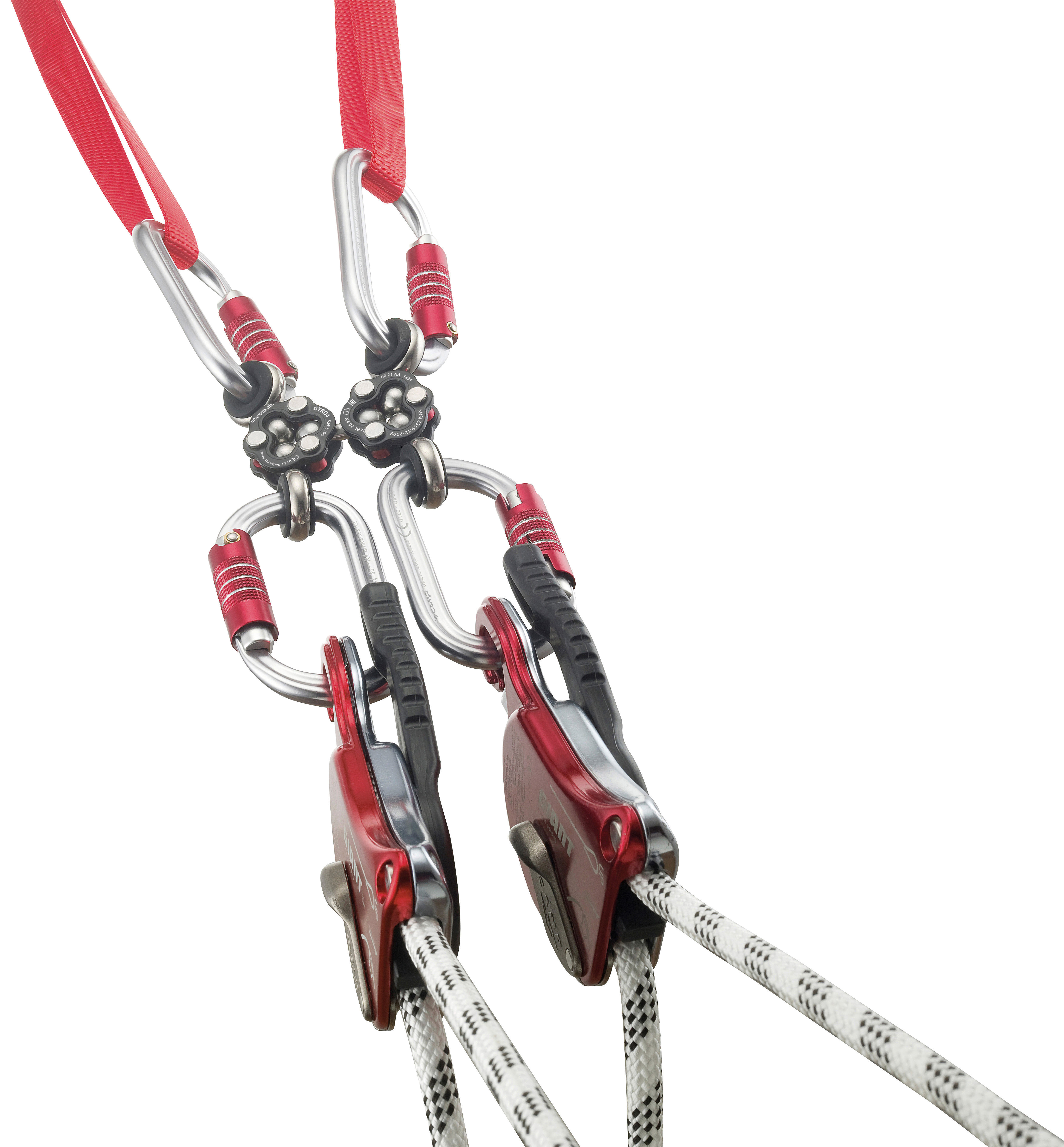 A revolutionary 3D swiveling rigging plate equipped with 4 connection points that rotate independently to allow them to be self-orienting even in the most complex rigging scenarios.