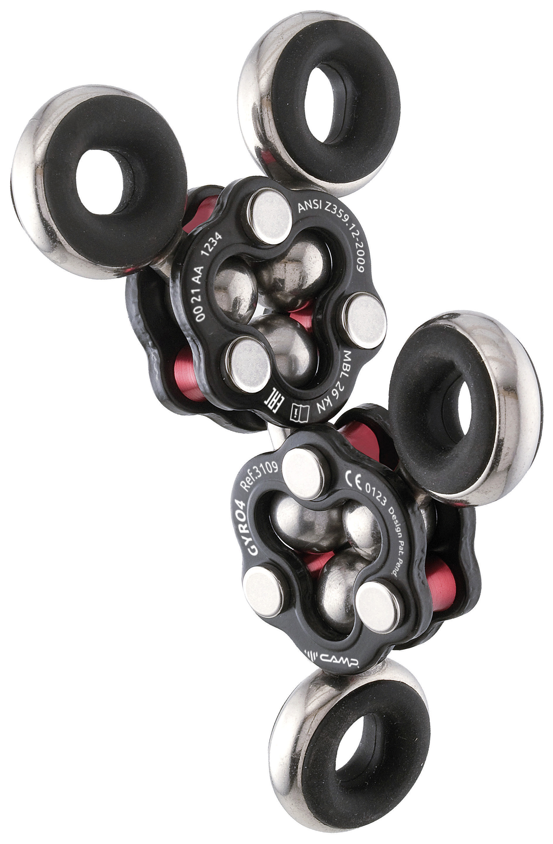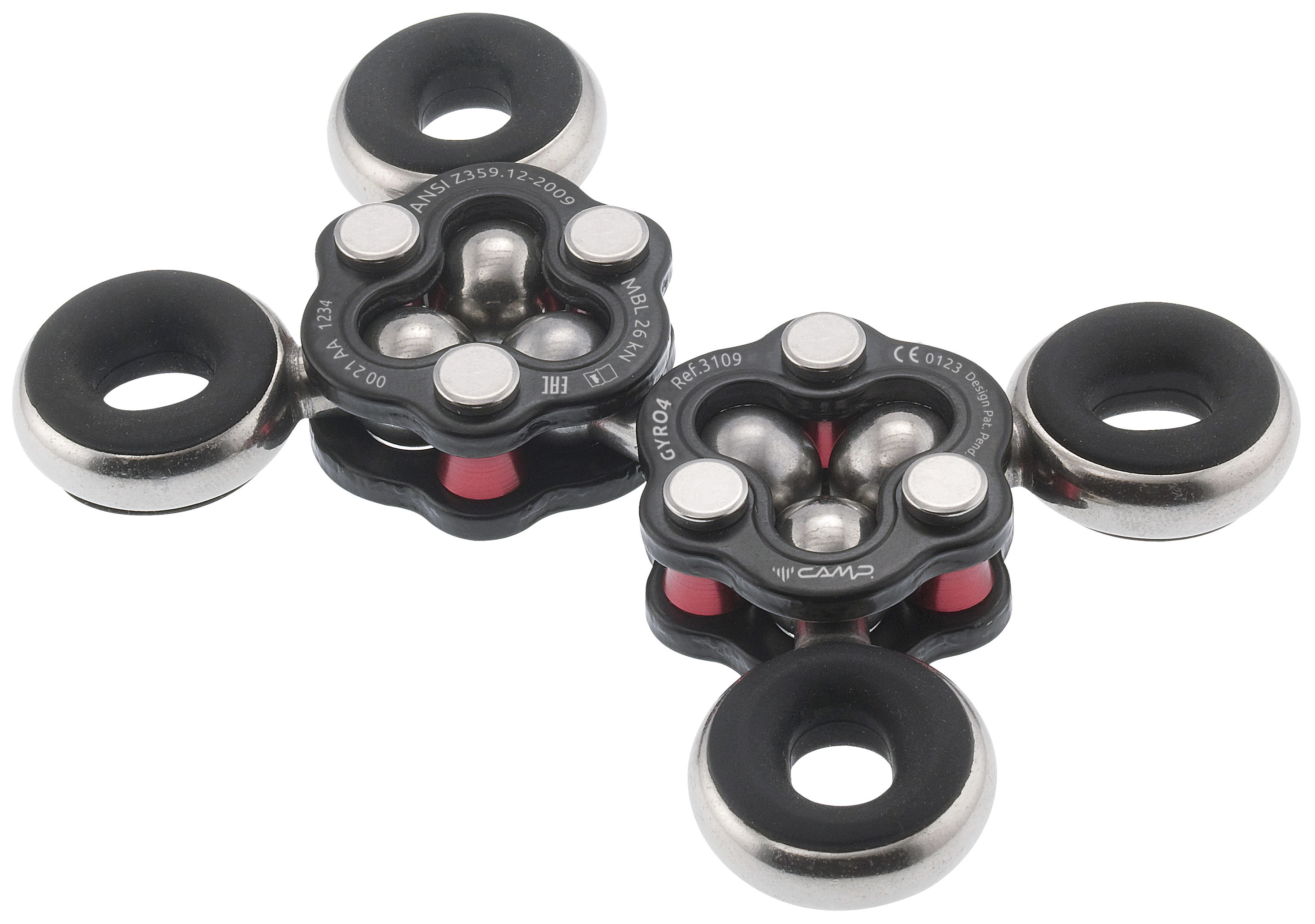 The Gyro4 system allows for countless possibilities of connection between different elements that need freedom of movement. The innovative design prevents the accumulation of dirt and makes inspection easy. Main structural flanges are carbon steel with a double corrosion preventive coating. Swivel balls and attachment points are stainless steel. Includes four removeable silicon anti-rotation inserts. Working load limit: 3 kN. Minimum breaking strength: 26 kN. Working load limit and minimum breaking strength are doubled when the two main bodies are oriented horizontally.