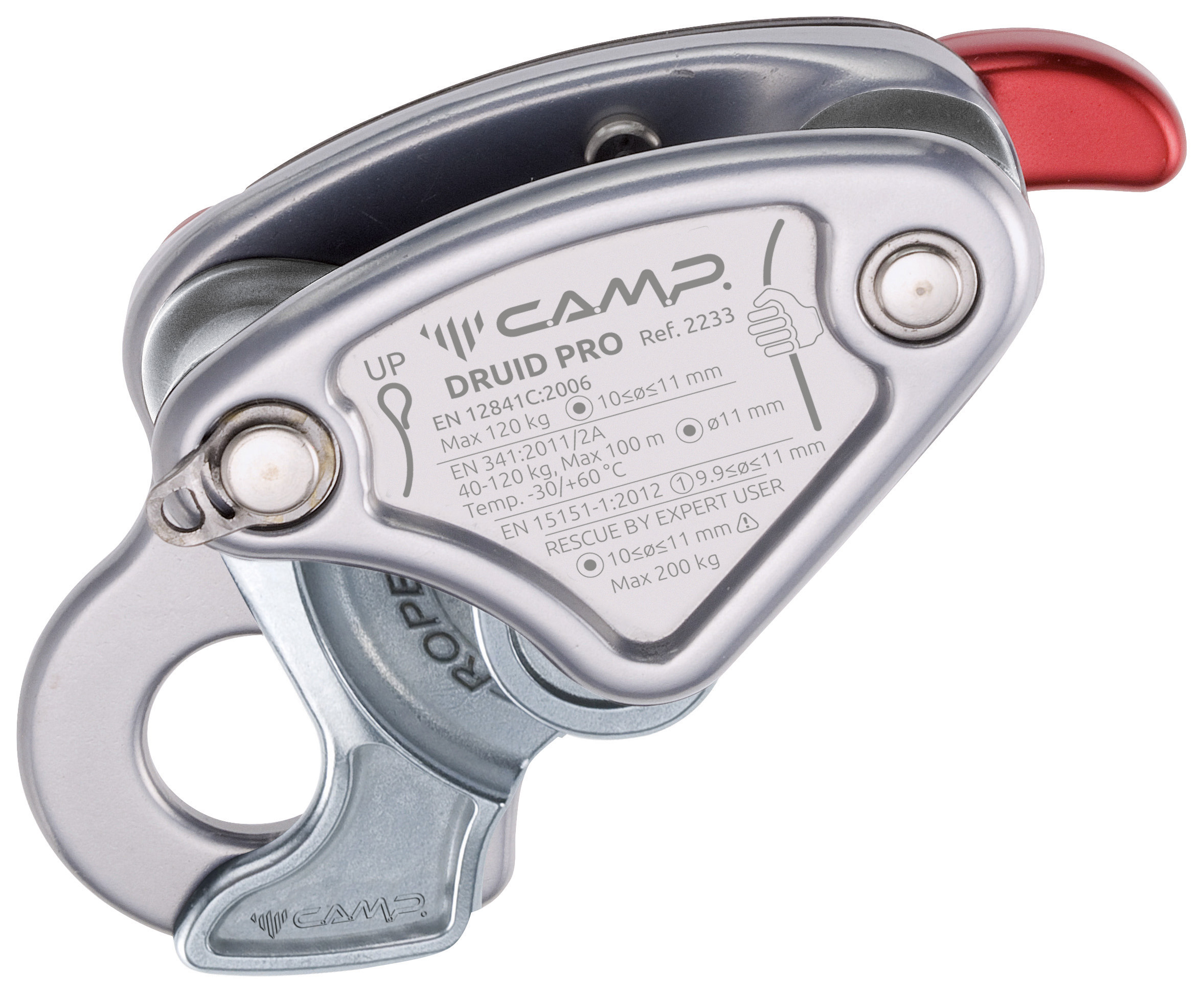 A lightweight, compact auto-braking descender for rope access and rescue designed for semi-static ropes ranging from 10-11 mm. Designed for expert users; the lever does not have the anti-panic function. The body and lever are made of robust hot-forged aluminum alloy. Mechanical parts are made of precision-cast stainless steel. The internal mechanism and locking cam use a innovative design for smooth action on the rope which prevents rapid wear-and-tear and absorbs energy from small shocks with a slight amount of rope slippage. The fluid action on the rope also allows the Druid to function well for rope ascent. The cam can be de-activated with a trigger to allow quick sliding of the rope in situations with no load or limited load. Steel ring for attaching a keeper cord. Standards: - EN 12841/C as a descender of the working line for workers up to 120 kg; can also be used for rope access rescue up to 200 kg. - EN 341/2A as an emergency evacuation device on a single line for workers up to 120 kg, 11 mm semi-static rope (Lithium 11 mm). - EN 15151-1 for climbing structures using mountaineering techniques with dynamic ropes ranging from 9.9 to 11 mm.