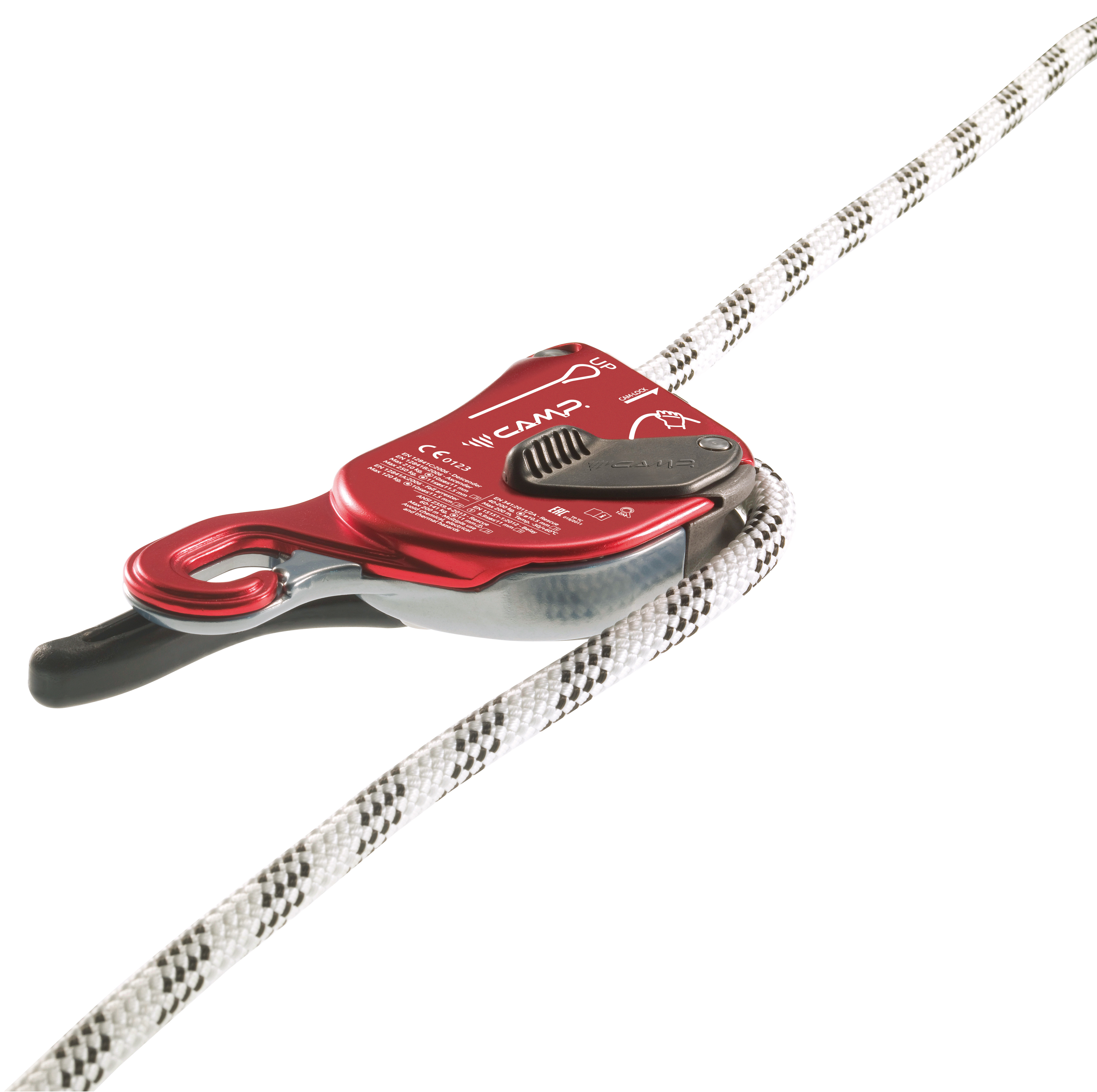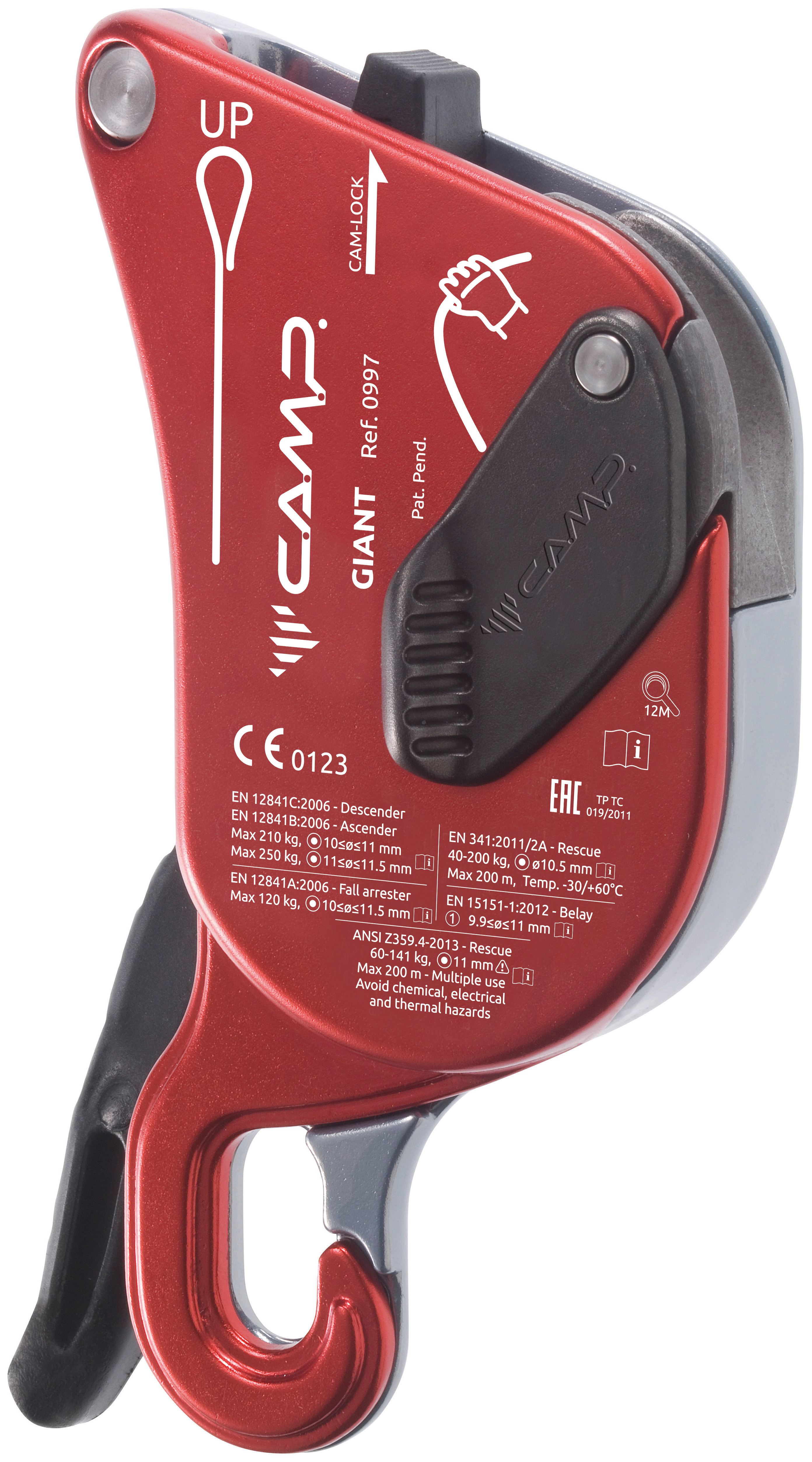 An innovative multifunctional descender developed to meet the demands of the most technical rope access and rescue specialists. The internal mechanism combines with robust hot-forged construction and advanced ergonomics for exceptional control even with heavy loads (up to 250 kg for two person scenarios). In addition to its primary function as a descender, the Giant is also certified for use as a fall arrest device (i.e. during rope transfers), as an ascender with smooth upward glide, and as a belay device for climbing, making it the most widely certified rope tool of its kind. The actuating lever features an anti-panic system that locks the rope and arrests the descent in case of excessive pressure on the lever by the user as well as an extra lock off position so the worker does not have to tie off the device. An external button can be used to hold the cam open allowing the rope to slide easily in situations with limited or no load. The device can be opened to insert or remove the rope without removing the carabiner (this helps prevent the possibility of dropping the device). The large attachment hole allows for the insertion of a second carabiner making the two plates unopenable. The logical circular rope path along with clear internal and external markings makes installation of the rope simple and intuitive. Standards: - EN 12841 as a rope access device for semi-static ropes ranging from 10 to 11.5 mm: - Type C: descender of the working line for loads up to 250 kg (from 11 to 11.5 mm) or 210 kg (from 10 to 10.9 mm); - Type B: ascender of the working line for loads up to 250 kg (from 11 to 11.5 mm) or 210 kg (from 10 to 10.9 mm); - Type A: fall arrester for the safety line for loads up to 120 kg. - EN 341/2A as a rescue and evacuation descender for 10.5 mm semi-static rope (Iridium 10.5 mm) for loads up to 200 kg. - ANSI/ASSE Z359.4 as a rescue and evacuation descender for 11 mm semi-static rope (Iridium 11 mm). - EN 15151-1 for climbing structures using mountaineering techniques with dyna