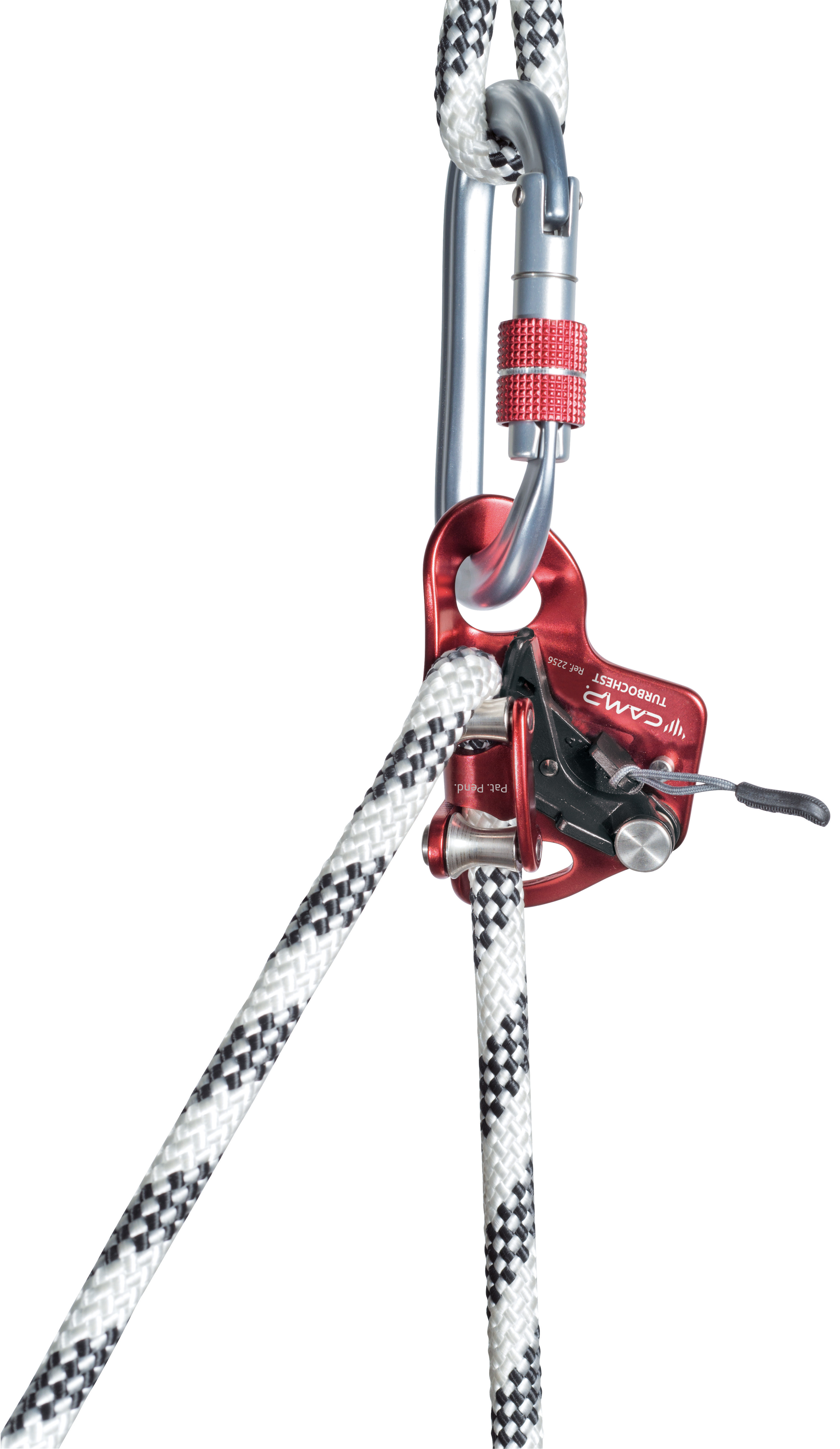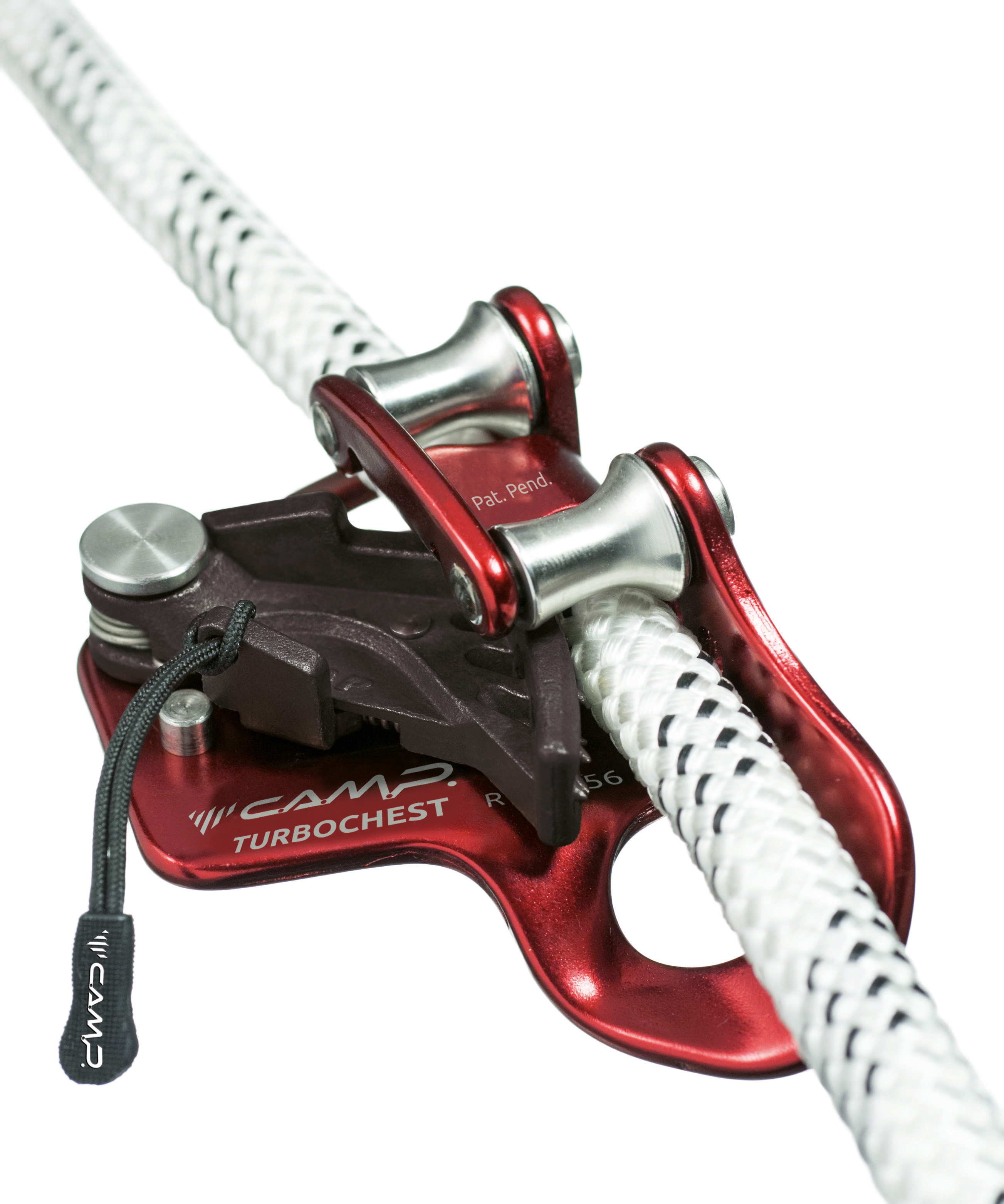 A revolutionary chest ascender that features two rollers for a smooth interface with the rope. This not only helps with climbing efficiency by making the upward glide much smoother.