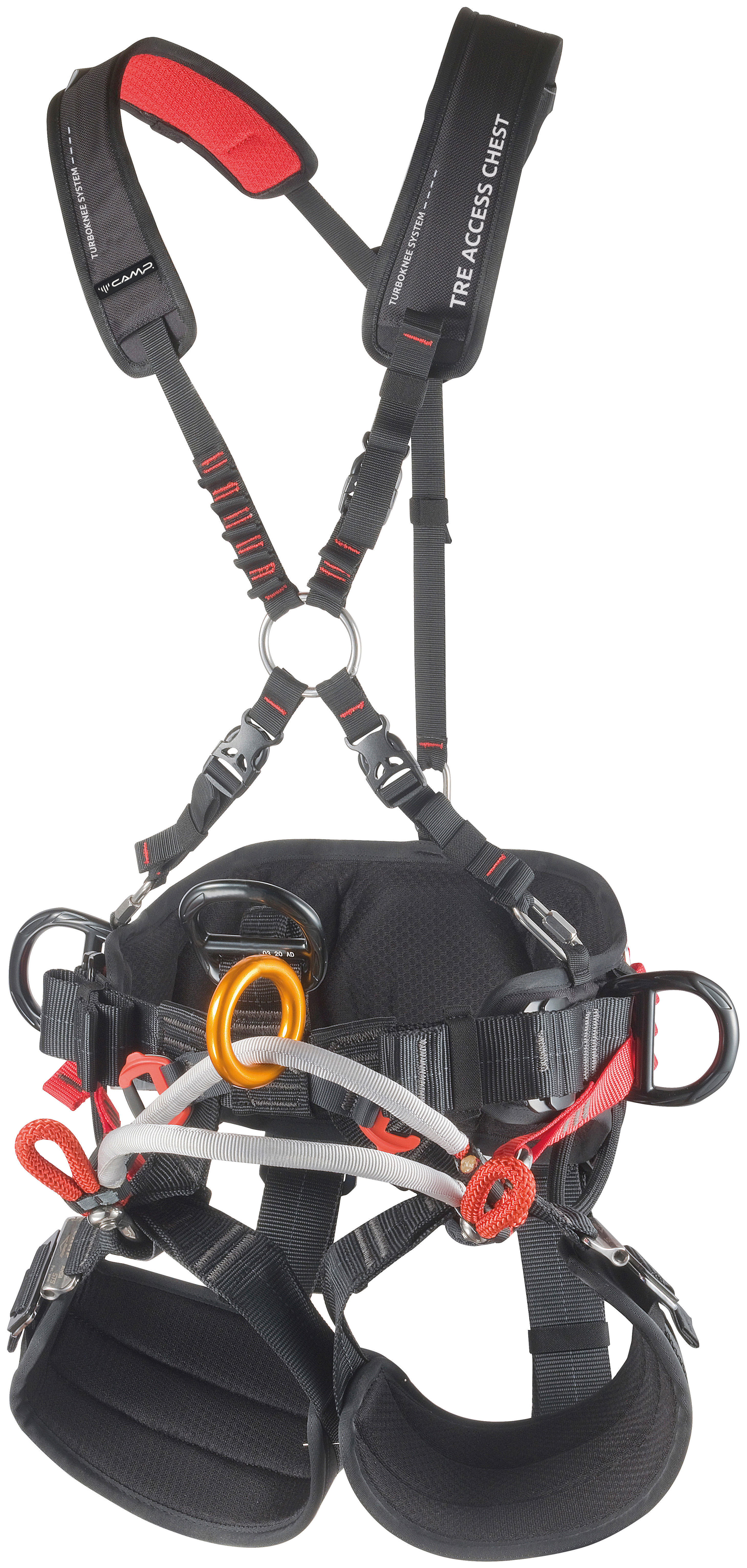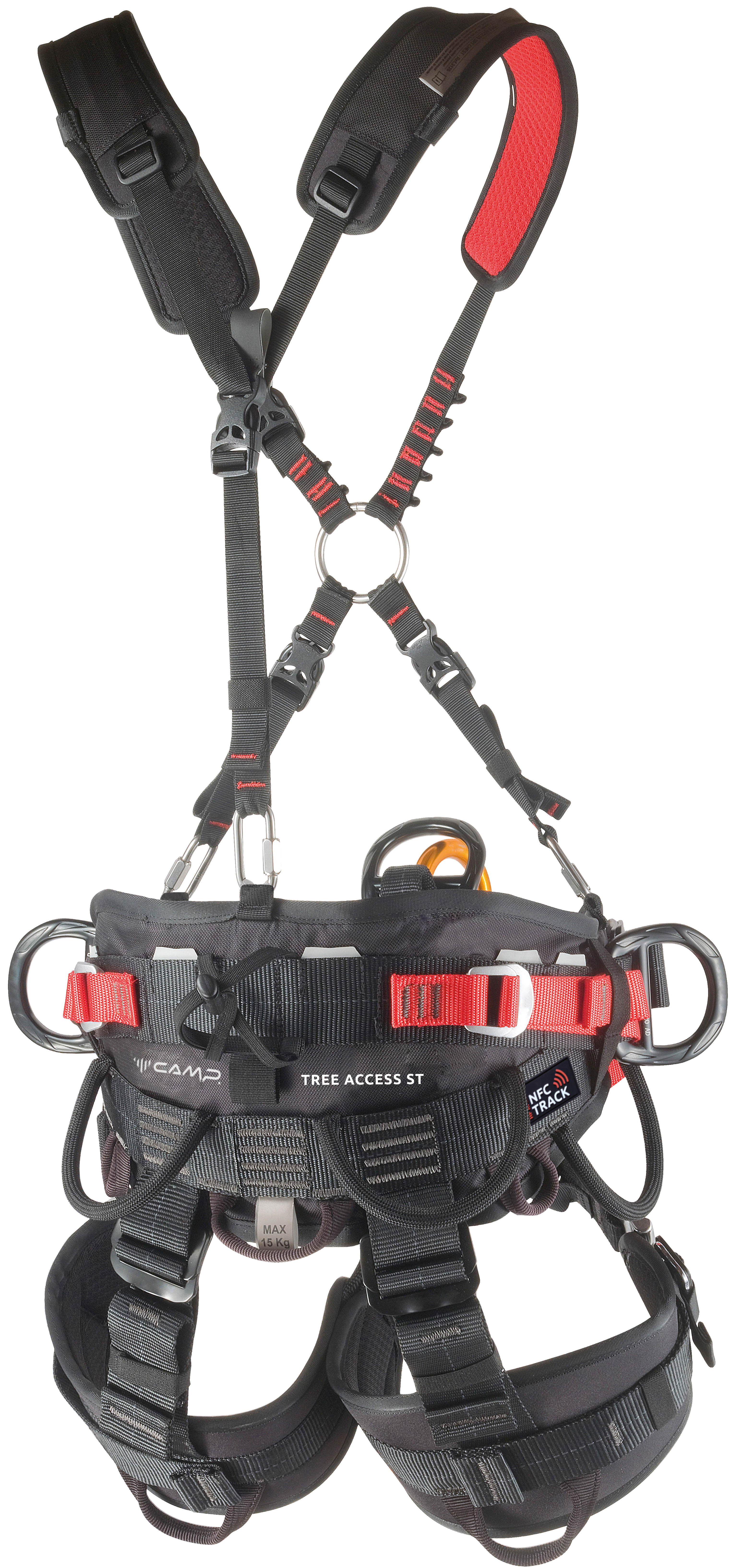 Designed to be used in combination with the Tree Access SRT Chest progression chest part and the Turboknee System ascender for SRT. The sturdy build meets European CE EN, ANSI and ASTM standards. The harness offers many connection possibilities for efficient organization, work and positioning: two mobile attachment bridges made of rope reinforced with tubular webbing; side loops at the ends of the lower bridge and aluminum alloy ring on the upper bridge; double ventral attachment point, one metallic and one textile; two side rings on the belt; numerous gear loops and slots for the Kilo gear carabiner. The comfort is incomparable: adjustable connection of the mobile bridges to the belt allow the worker to adjust the position of suspension; ergonomic padding with variable thickness; low-profile STS ANSI buckles on the leg loops. Equipped with NFC TRACK tag for digital identification. 2 sizes.